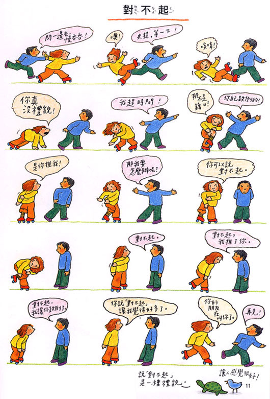 ■ 當遇到他人沒有禮貌時:「媽媽,那個人撞到我都沒有說對不起……」現實生活中難免遇到這種狀況,這時,爸媽要避免數落對方,或許可以試著這麼說:「我想那個人不是故意的,你看他走得這麼快,一定是有急事才來不及說,我們原諒他好不好?不過如果是你不小心撞到別人的話,還是要記得說對不起喔!」試著引導孩子用正面的角度來看待他人的行為,但還是要確認應有的行為準則,避免孩子產生懷疑或混淆。